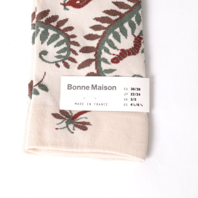 ボンヌメゾン (Bonne Maison) 蔦柄バードソックス コットンストレッチ ホワイト