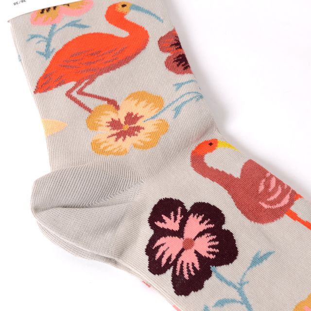 セラドングリーンの背景にバーミリオンレッド、アークティックブルー、クラフトイエロー、サルファーイエローのトキ。つま先にはドライローズピンク。華やかな色合いと可愛いモチーフがキュートな靴下です。
