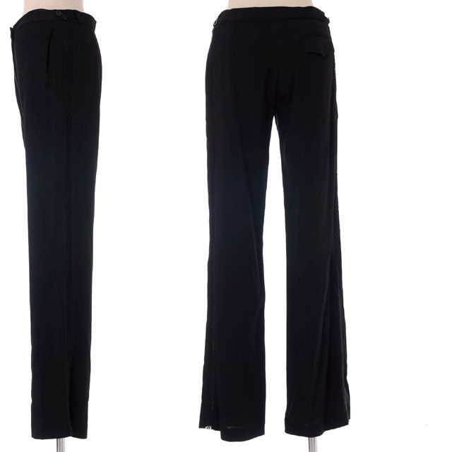 シャロンワコブのサイドレースパンツ。トロンとした落ち感が美しいブラックフォーマルパンツ。サイドにレースをあしらったエレガントなデザイン。ポケット付きで、ヒップでお召しいただくタイプ。裏地付き。