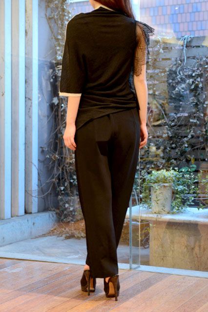 シャロンワコブのレースフロントパンツ。一見シンプルな8分丈パンツ、よく見るとこったデティールが施されたエレガントなパンツです。ドット柄のパンチングの入ったレースを表に使用し、後ろ側はストレッチジャージーを合わせたパンツ。ややサルエル風のシルエット。ドット部分が透けていてとてもキュート。裏地付き。