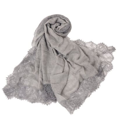 ファリエロサルティの大判レースストール。繊細なレースを四方にあしらった、美しいストール。上品なグレーカラー。エレガントな装いにも、カジュアルな装いにもお試し頂けるストール。襟元を華やかに彩る、オススメのストール。ファリエロサルティのレースストールは、実店舗で人気のアイテム。オンライン販売されているところも少ない、希少性のあるレースストールです。